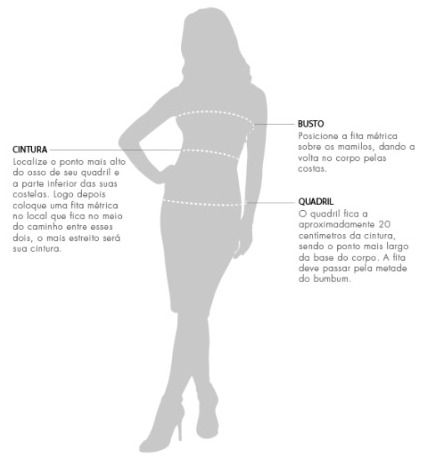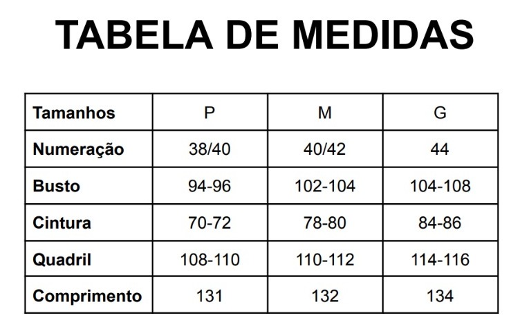 Ombro: 33cm , Busto 98cm , Cintura 66cm, Quadril 98cm , Altura 1,60m